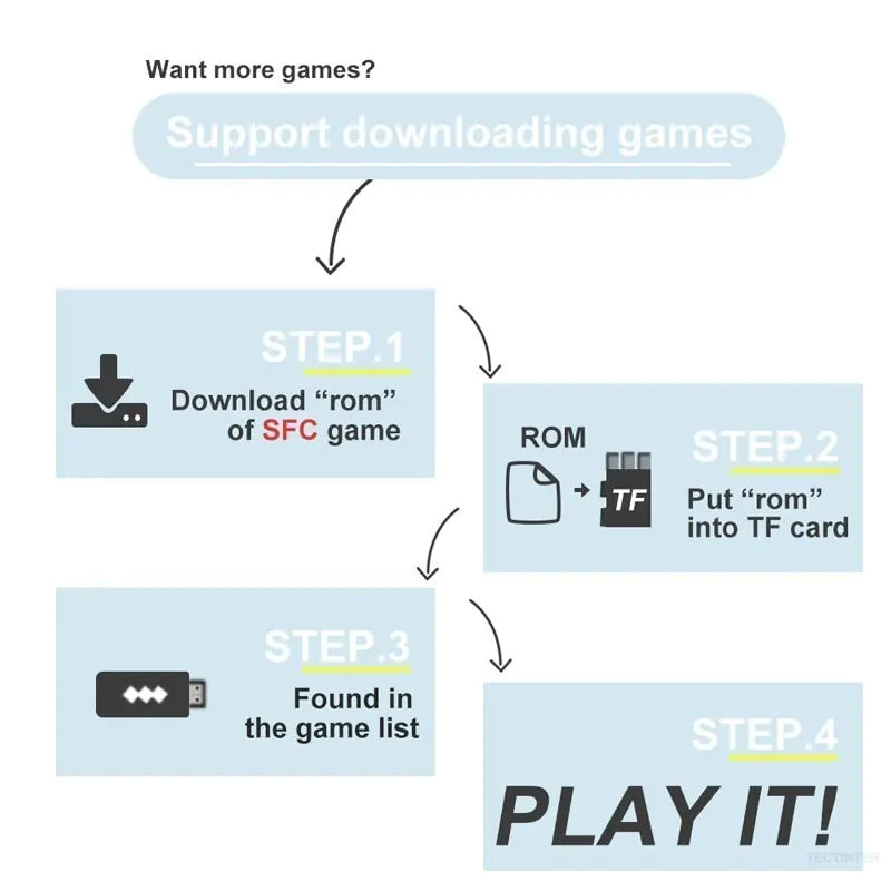 Moreover, the SF900 isn't just about playing the classics; it's about expanding your horizons. With support for downloading games in SFC format, your gaming library is virtually limitless. Combined with an ergonomic design that ensures comfort during those marathon gaming sessions, this video game console is the ultimate companion for both high-energy party gaming and relaxing solo adventures.